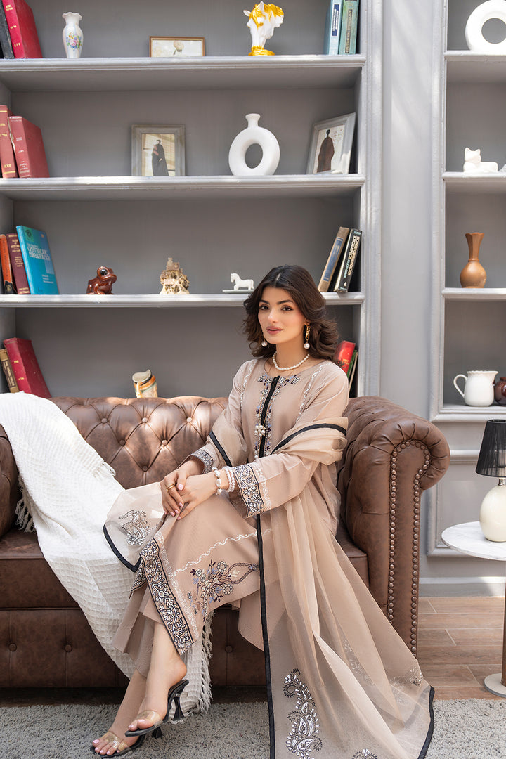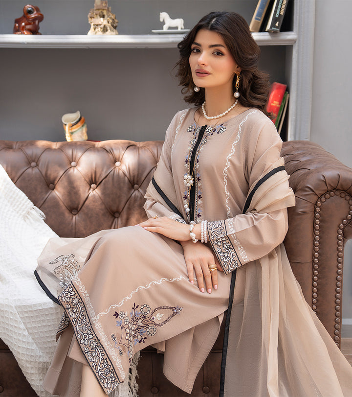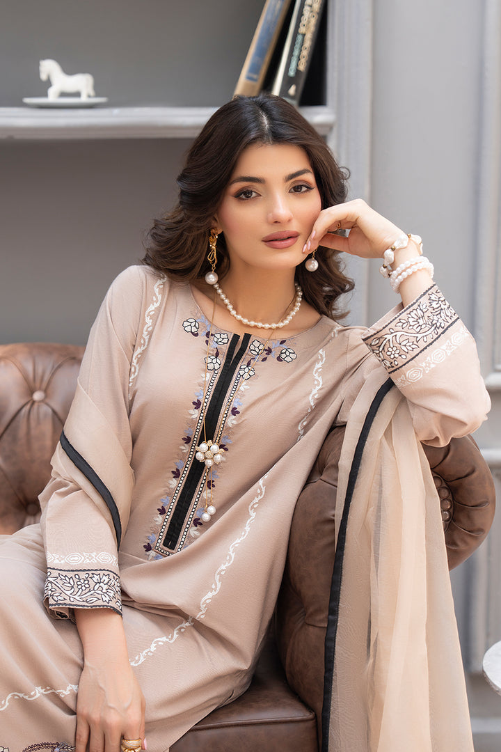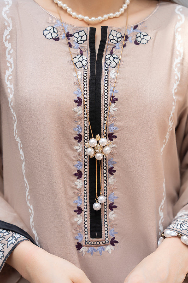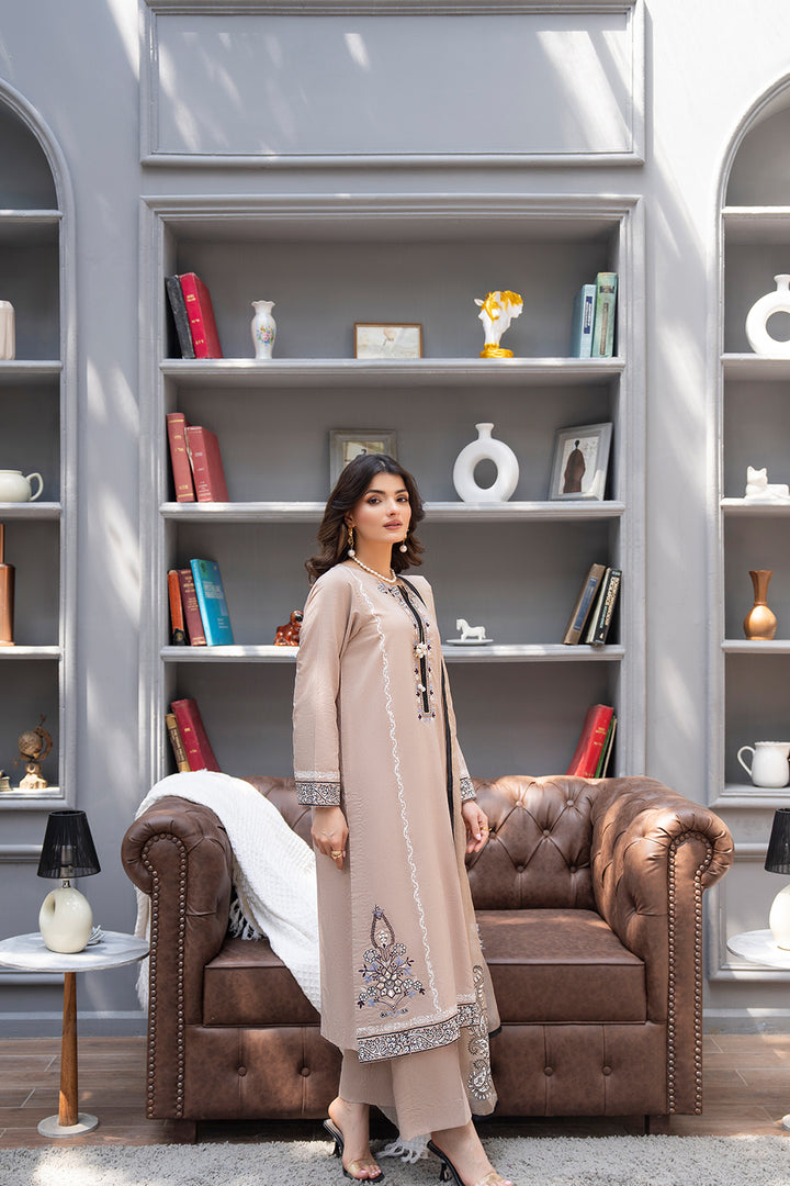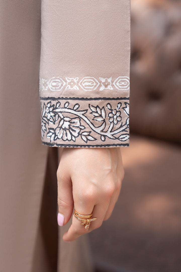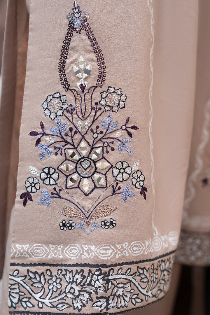 The outfit is a timeless expression of elegance, featuring a khaddi silk shirt adorned with intricate machine embroidery in resham n mirror work. Hand block print on shirt n dupatta corners gives a completely timeless look.