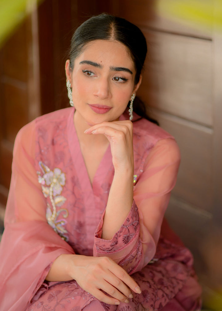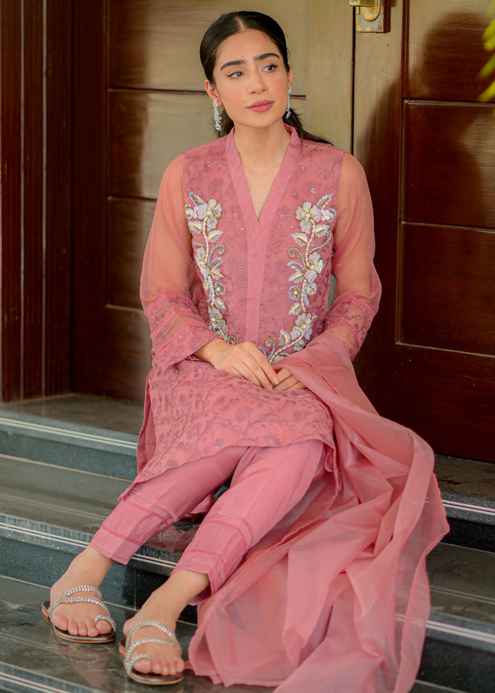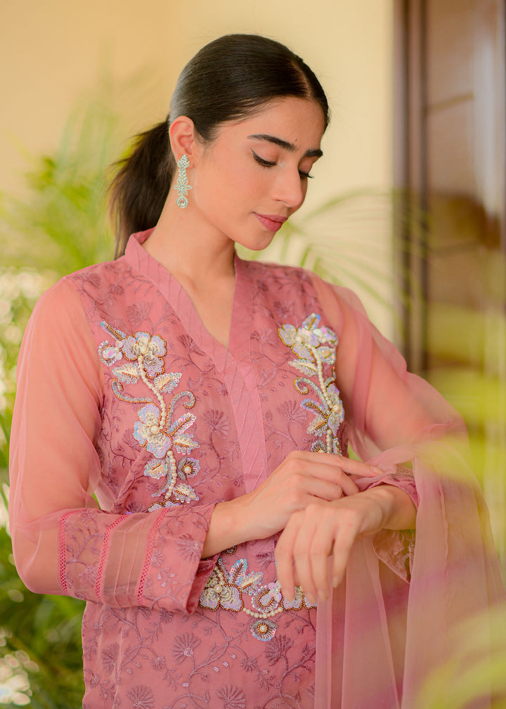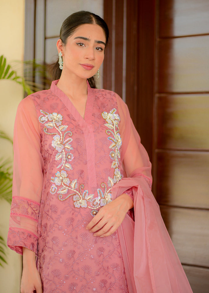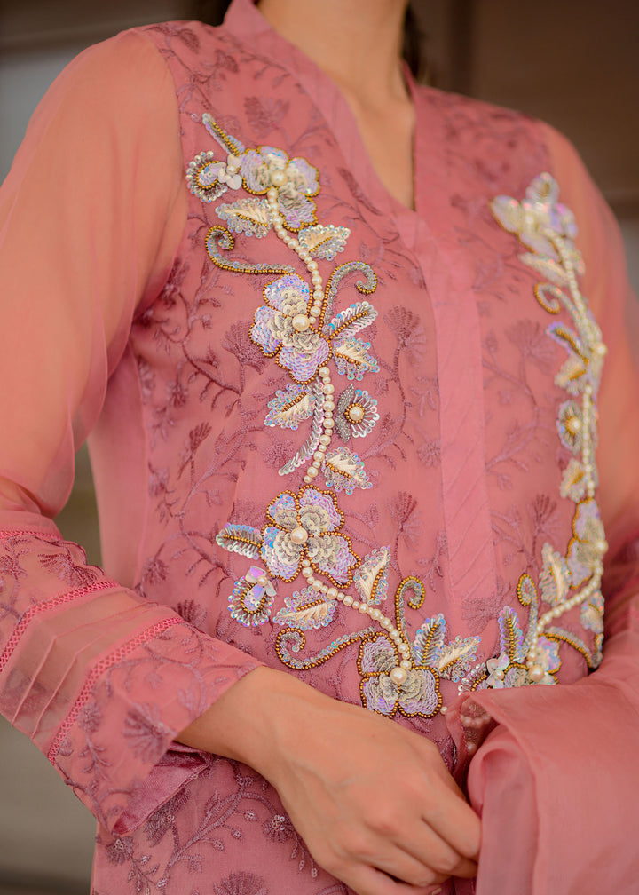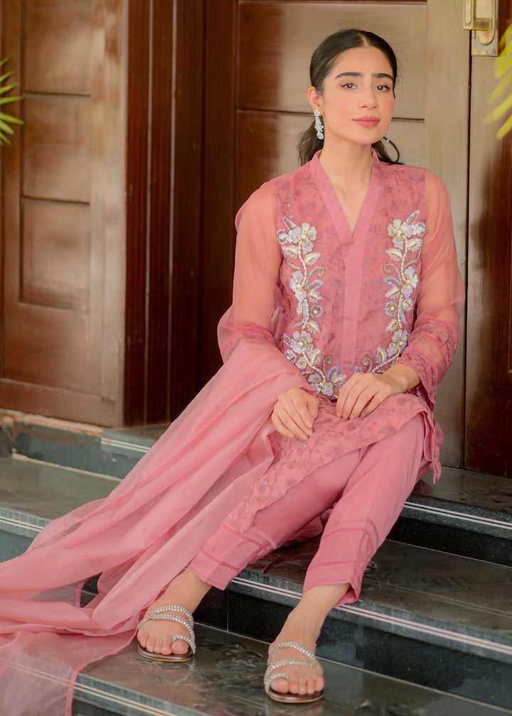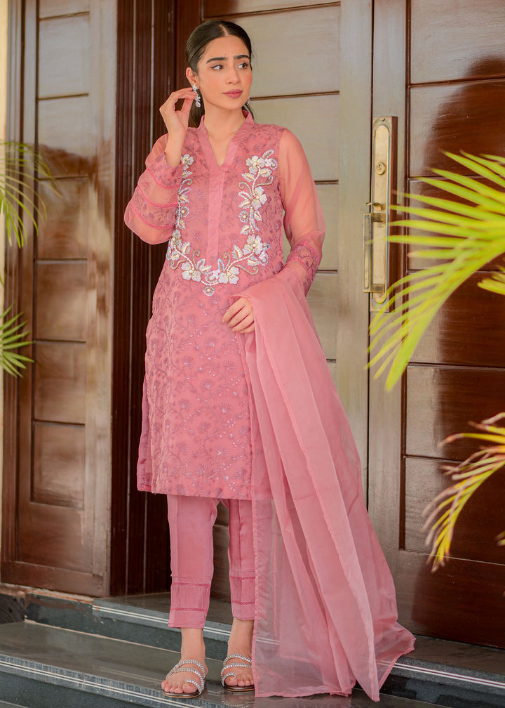 Embroidered organza shirt enhanced with alluring neckline embellished with sequins pearls. Paired with straight pants and organza dupatta