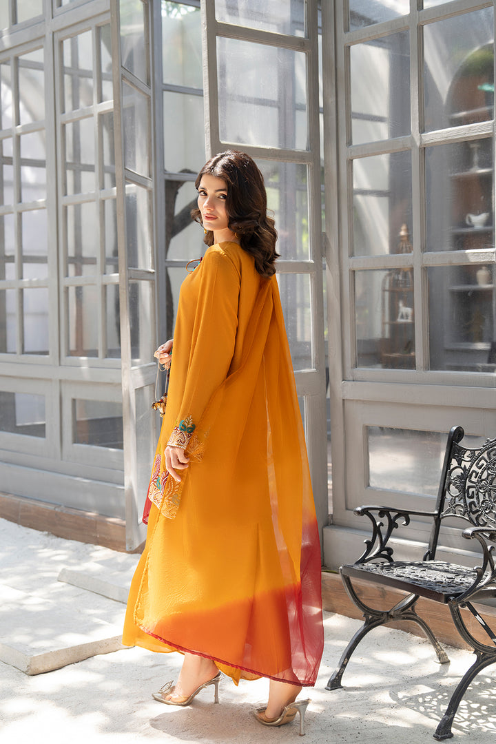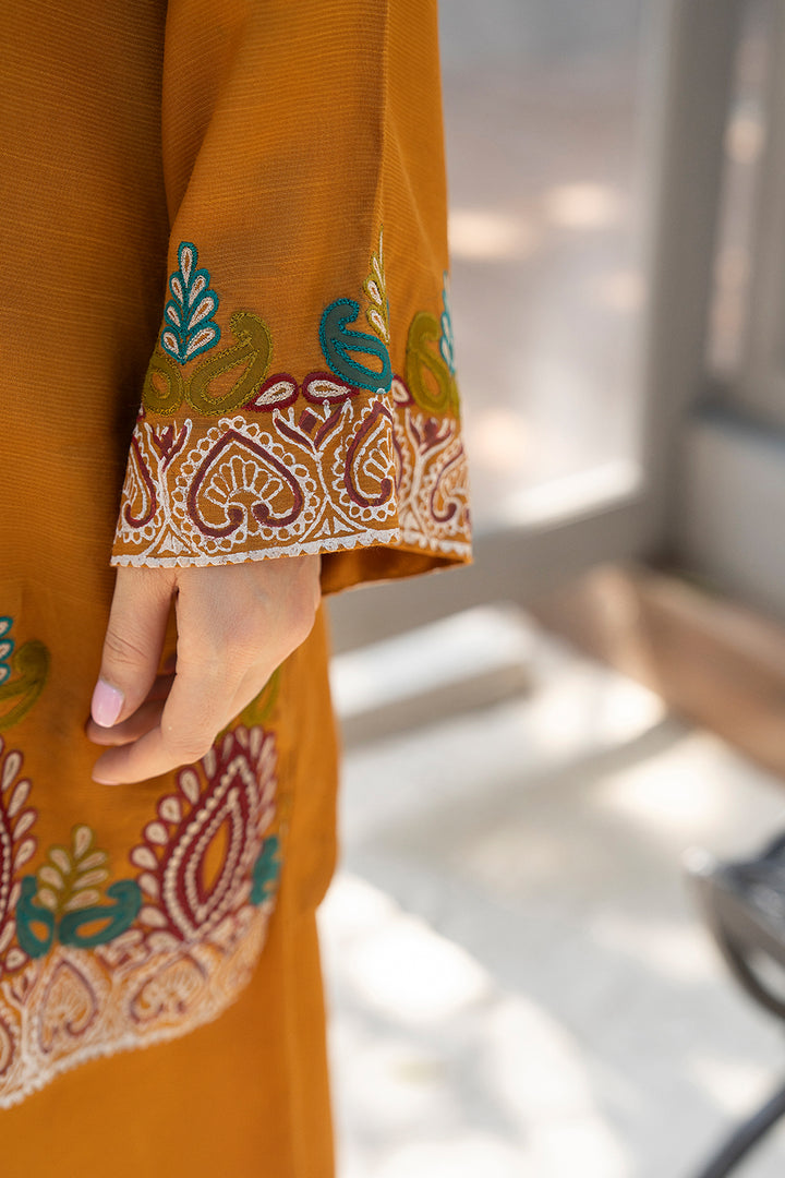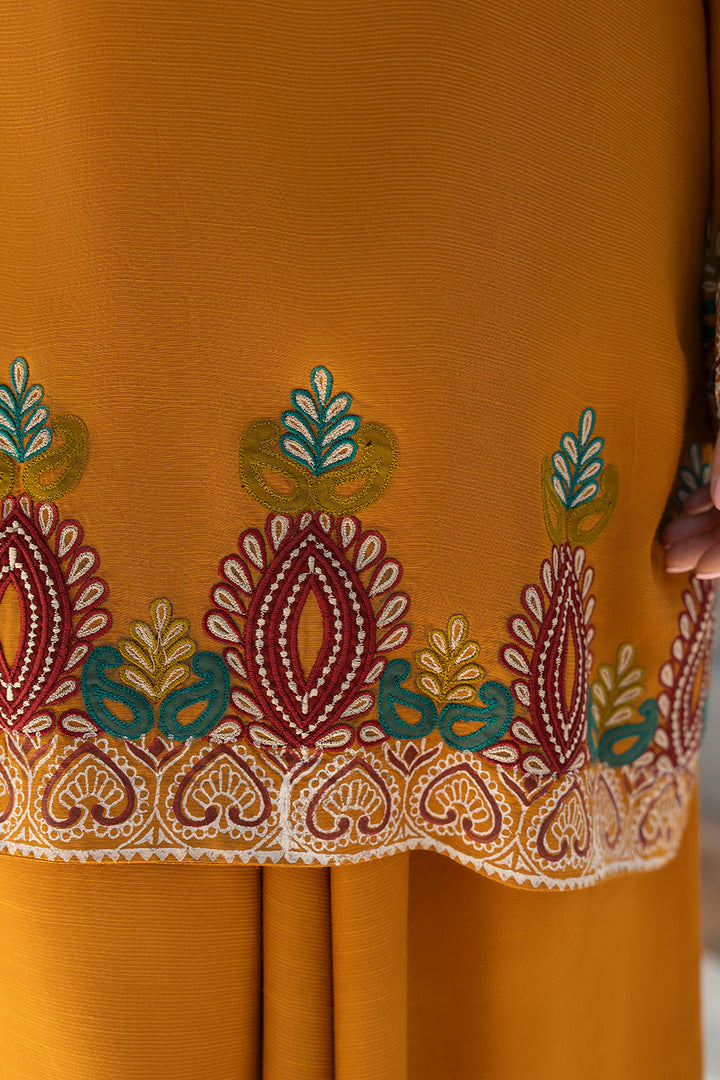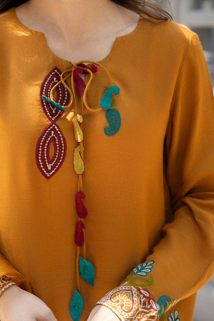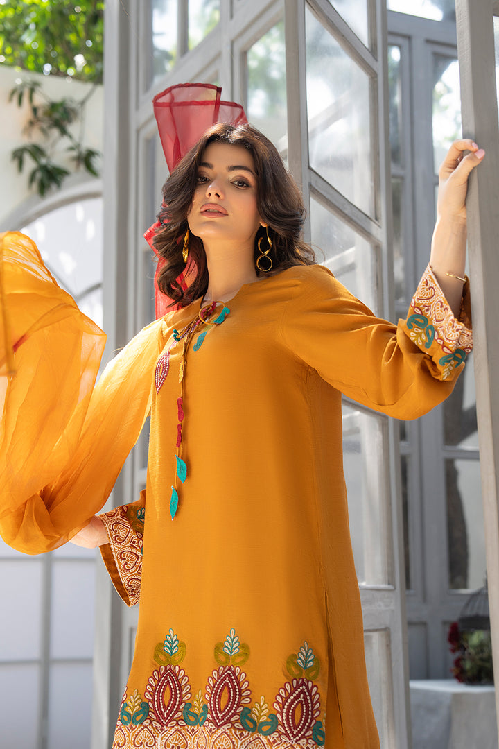 Fabric: Rawsilk Dupatta: Organza This dress features bold applique embroidery with hand block print. It's a vibrant mustard hue, and elegant detailing makes it perfect for any occasion .
