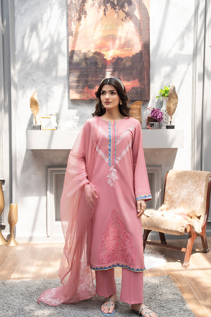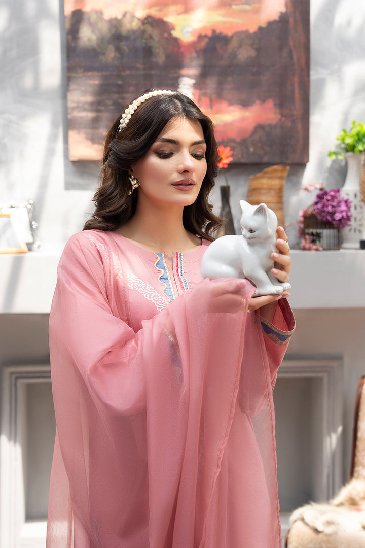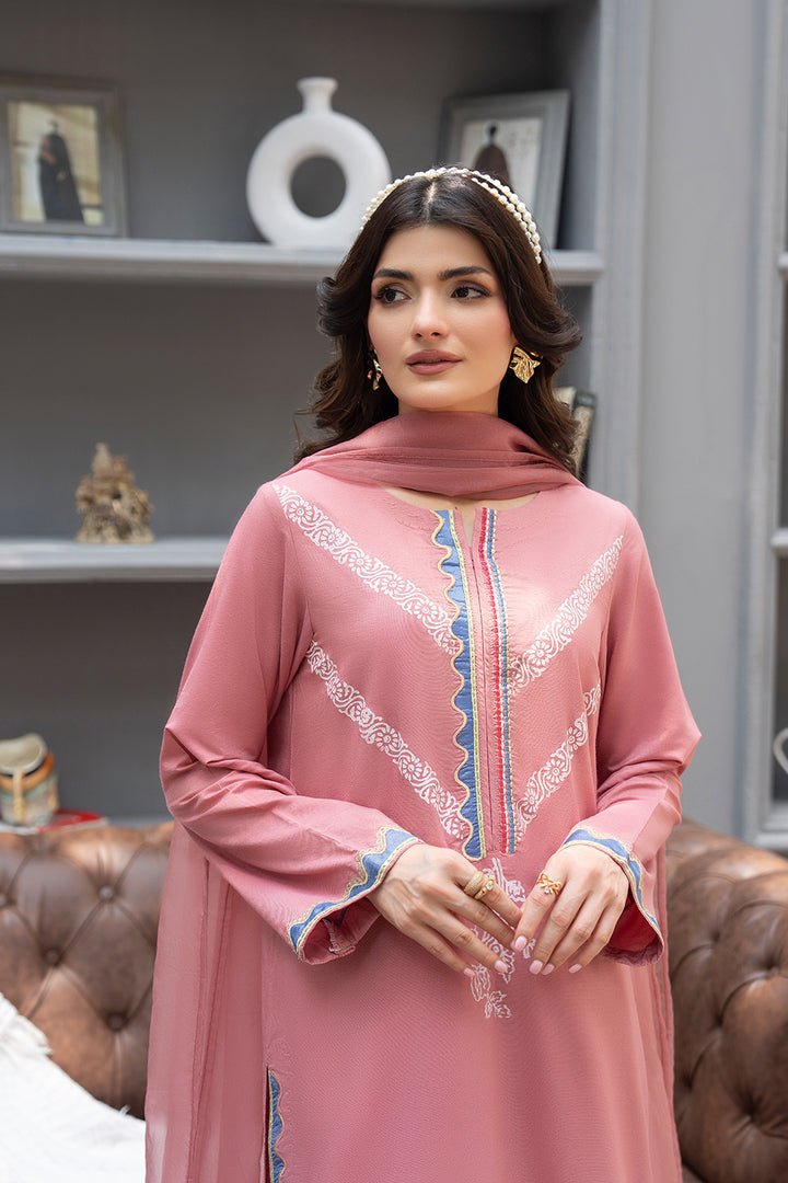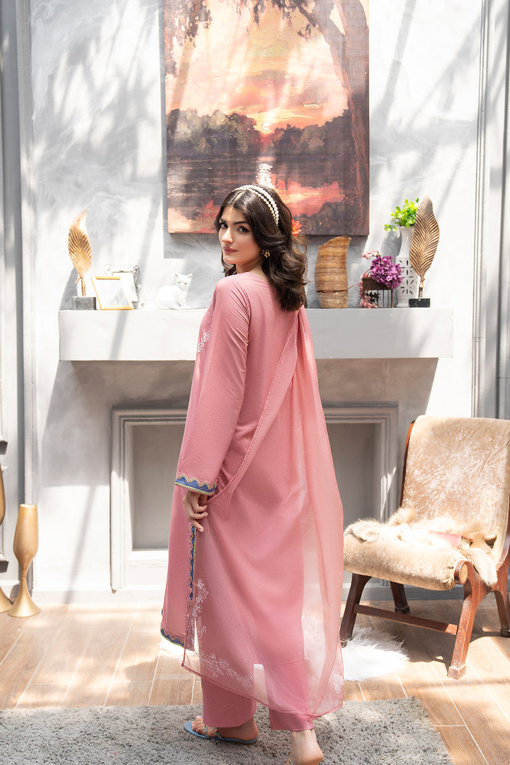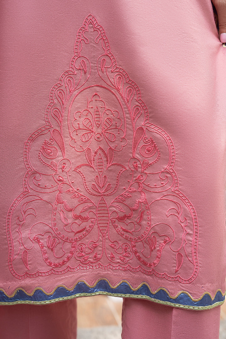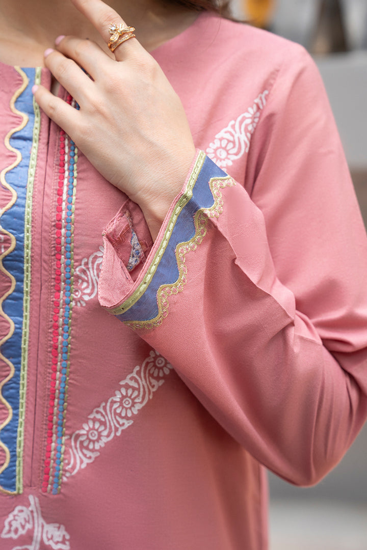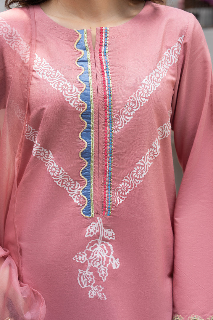 The elegant outfit features Khaddi silk shirt with intricate machine embroidery, a blend of hand block print. It is adorned with applique embroidery on choks and hem. Complementing the look is a soft Organza dupatta with hand block print corners.